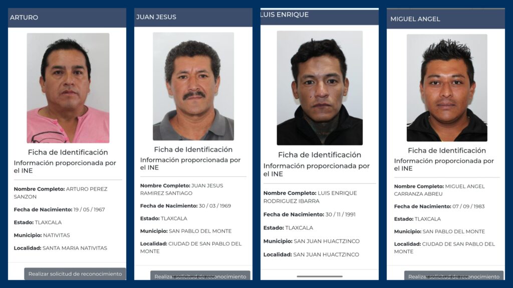 Las cuatro personas fueron localizadas sin vida en distintos puntos del estado de Puebla en fechas anteriores y trasladadas al Servicio Médico Forense (SEMEFO). Gracias al nuevo sistema de identificación dactilar implementado por la Fiscalía de Puebla, se logró establecer su identidad y su vínculo con el vecino estado de Tlaxcala; sin embargo, hasta el momento ningún familiar ha iniciado los trámites para su reconocimiento formal y posterior entrega.