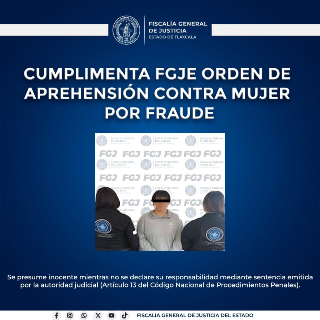Elementos de la Policía de Investigación de la Fiscalía General de Justicia del Estado (FGJE) cumplimentaron una orden de aprehensión en contra de Yareli N., por su probable participación en el delito de fraude.