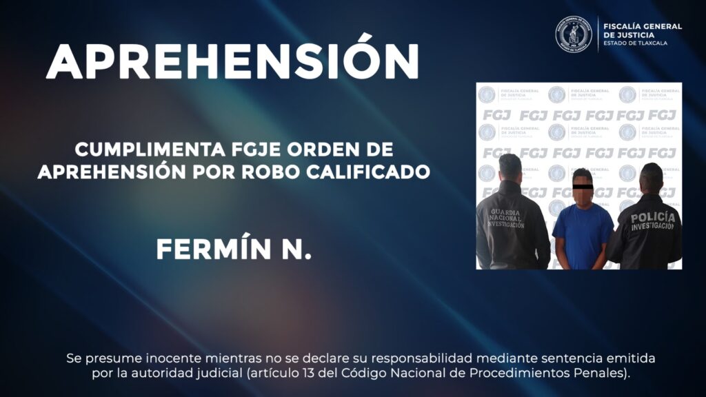 Elementos de la Policía de Investigación de la Fiscalía General de Justicia del Estado (FGJE) cumplimentaron una orden de aprehensión en contra de Fermín N., por el delito de robo calificado.