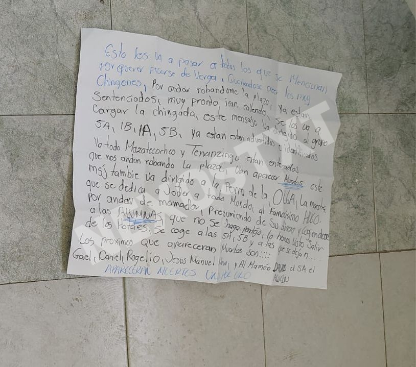 “Ya están advertidos e identificados, ya todo Mazatecochco y Tenancingo están enterados que nos andan robando la plaza, van a aparecer muertos. Este mensaje también va dirigido a la (directora)… y a un sujeto identificado como Hugo”, se leía en el texto.