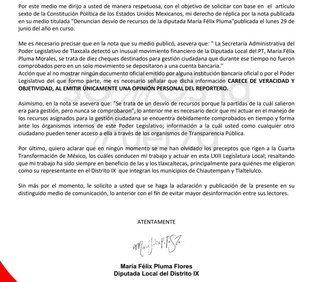 Por este medio me dirijo a usted de manera respetuosa, con el objetivo de solicitar con base en el artículo sexto de la Constitución Política de los Estados Unidos Mexicanos, mi derecho de réplica por la nota publicada en su medio titulada “Denuncian desvío de recursos de la diputada María Félix Pluma”publicada el lunes 29 de junio del año en curso.
