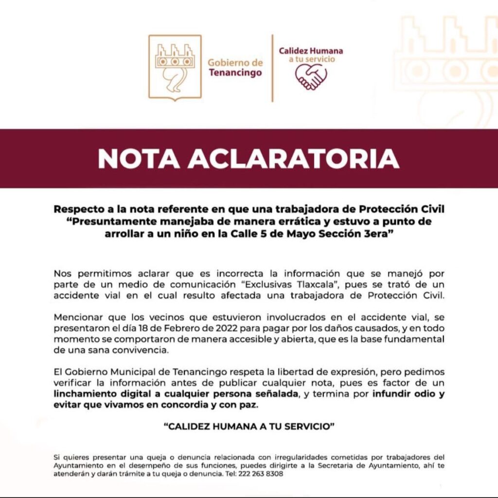La tarde de este día, mediante un comunicado a la ciudadanía y a través de un video, se reveló que la información difundida a través de “Exclusivas Tlaxcala”, en donde acusaban de manera dolosa a la responsable de Protección Civil Municipal, de supuestamente estar a punto de arrollar a un menor, es totalmente falsa.