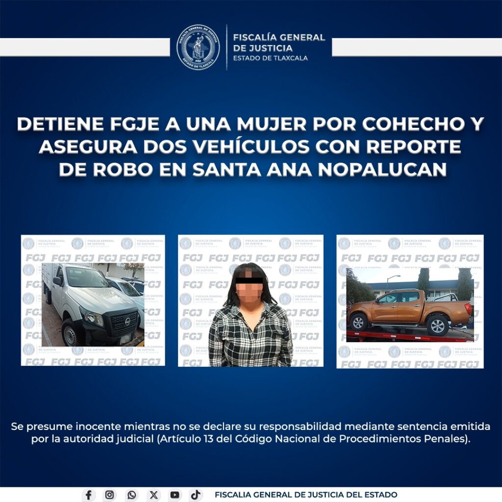 La Fiscalía General de Justicia del Estado (FGJE), a través de la Policía de Investigación, realizó la detención en flagrancia de Brenda N. por el delito de cohecho y aseguró dos vehículos que contaban con reporte de robo en el municipio de Santa Ana Nopalucan.