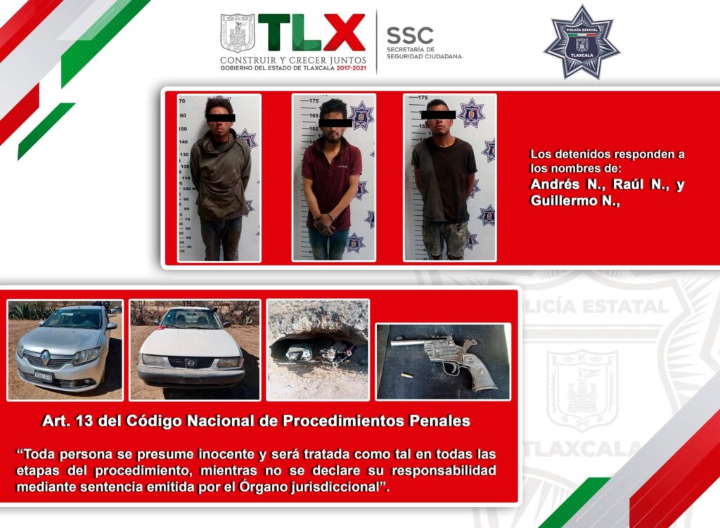 La Secretaría de Seguridad Ciudadana (SSC) a través de la Dirección de Operaciones y la Dirección de Investigación detuvieron este miércoles en el municipio de Calpulalpan a tres personas presuntamente dedicadas al robo de vehículos, igualmente aseguraron un arma de fuego, dos vehículos con reporte de robo vigente y uno más desvalijado.