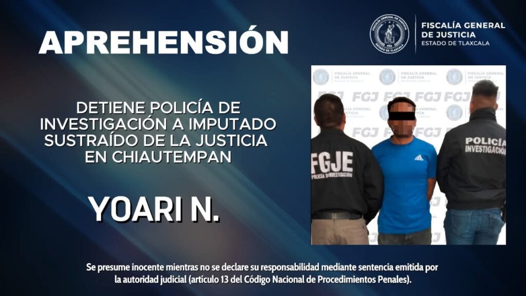 La detención se llevó a cabo en la colonia Reforma del municipio de Chiautempan, donde el imputado fue ubicado y asegurado por elementos adscritos a la región sur de la Policía de Investigación.