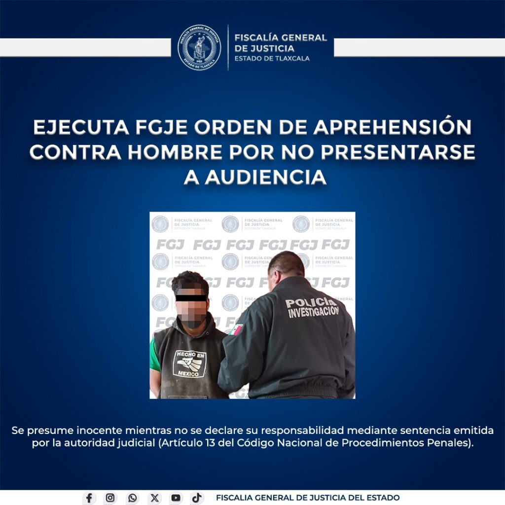 La Policía de Investigación de la Fiscalía General de Justicia del Estado (FGJE) ejecutó una orden de aprehensión en contra de Carlos N., por no presentarse a una audiencia en el proceso que enfrenta por los delitos de amenazas, daños y portación de objetos aptos para agredir, cometidos en agravio de una mujer y dos menores de edad.