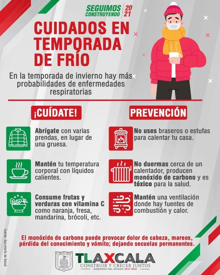 La CEPC exhorta a las familias tlaxcaltecas a evitar cambios bruscos de temperatura, al momento de salir cubrir cabeza y cara con prendas abrigadoras e incrementar el consumo de bebidas calientes y alimentos ricos en Vitamina C.