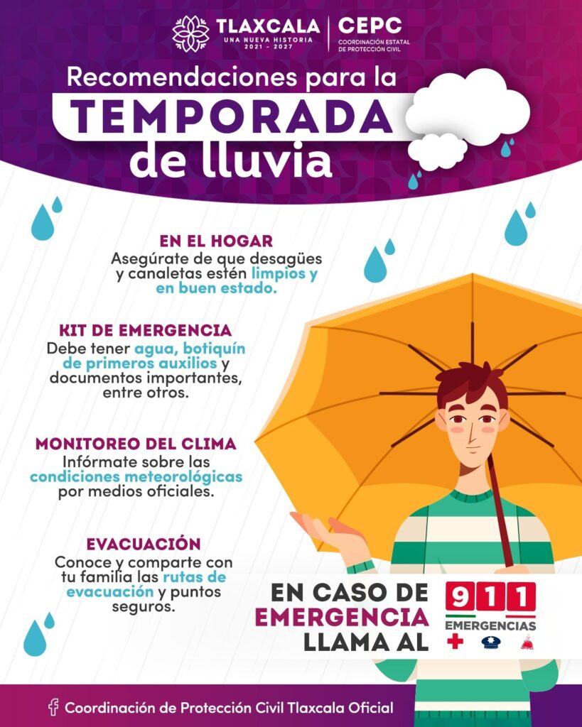 La Coordinación Estatal de Protección Civil (CEPC) llamó a la población tlaxcalteca a tomar precauciones ante el pronóstico de lluvias para los próximos días, con el objetivo de proteger la integridad y patrimonio de las personas y prevenir afectaciones a viviendas e infraestructura.