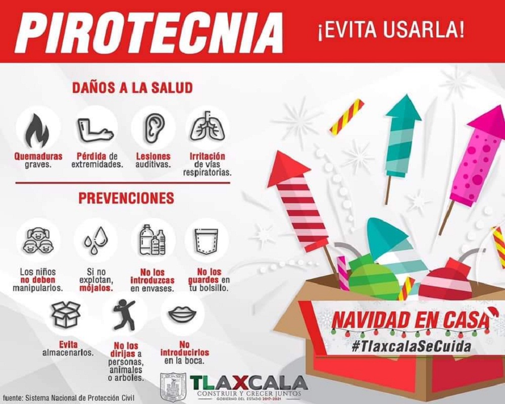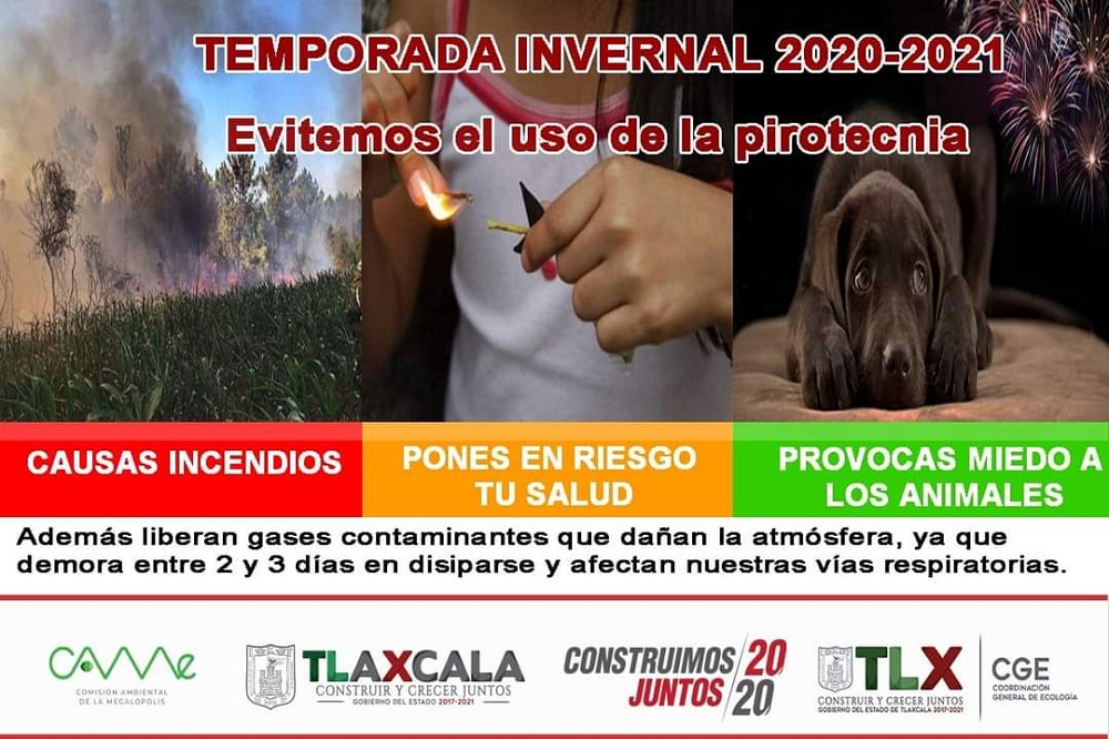 En tanto, la CGE exhortó a las familias tlaxcaltecas a evitar el uso de pirotecnia durante esta época del año, debido a que puede causar incendios forestales y su uso libera gases contaminantes que dañan la atmósfera, los cuales tardan entre dos y tres días en dispersarse y afectan las vías respiratorias de las personas.