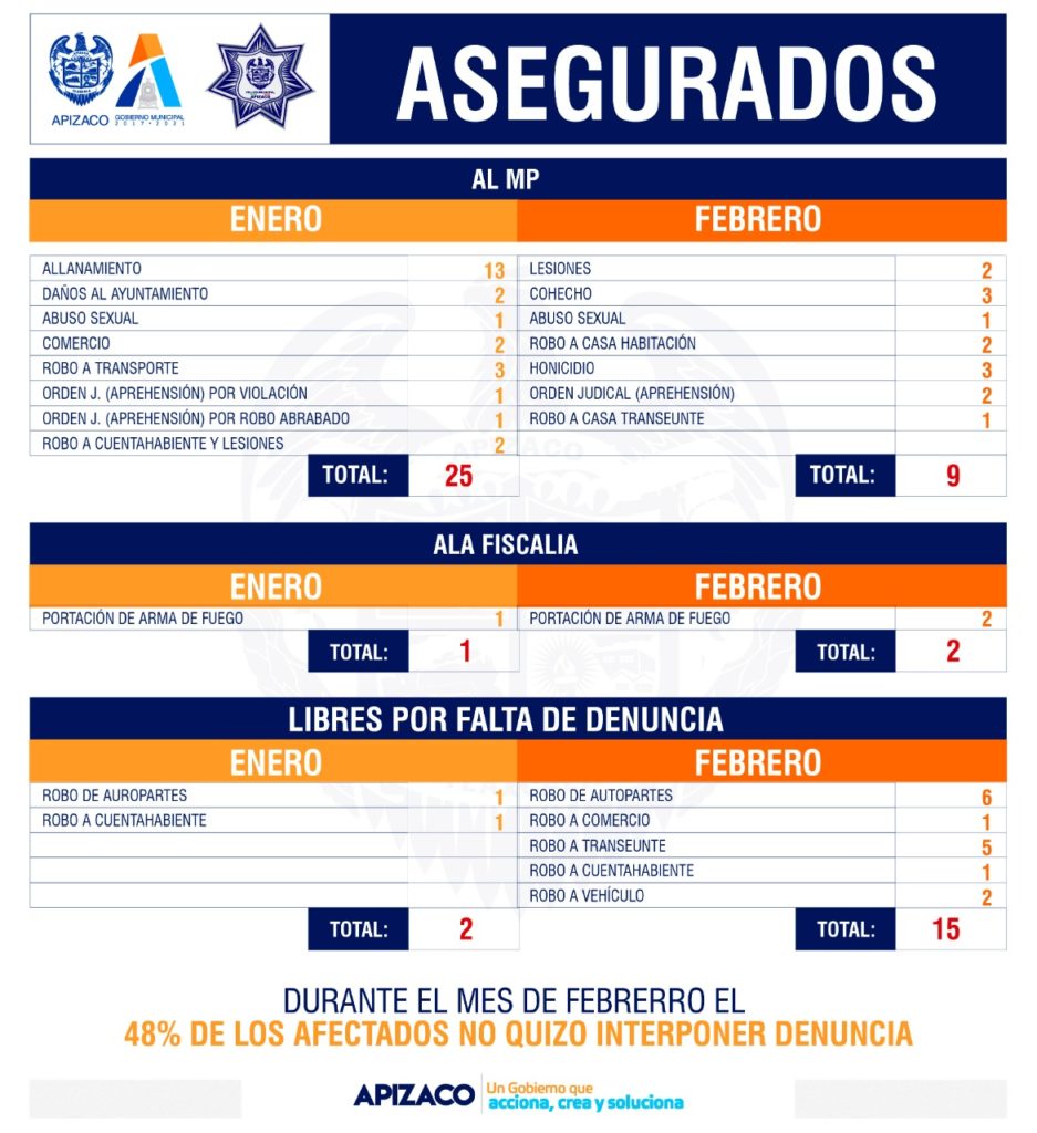 Durante el primer bimestre del año, la Dirección de Seguridad Pública, Vialidad y Transporte de Apizaco, puso a disposición del Ministerio Público (MP) a un total de 34 personas, entre las principales causas, por robo a comercio, abuso sexual, homicidio, robo a cuentahabiente, orden judicial por violación, otra, por robo agravado.