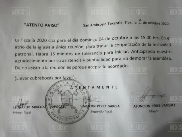 En plena pandemia por Covid19, las autoridades eclesiásticas de San Ambrosio Texantla, perteneciente al municipio de Panotla, citaron a los pobladores a una reunión para acordar aportaciones económicas para la festividad patronal.