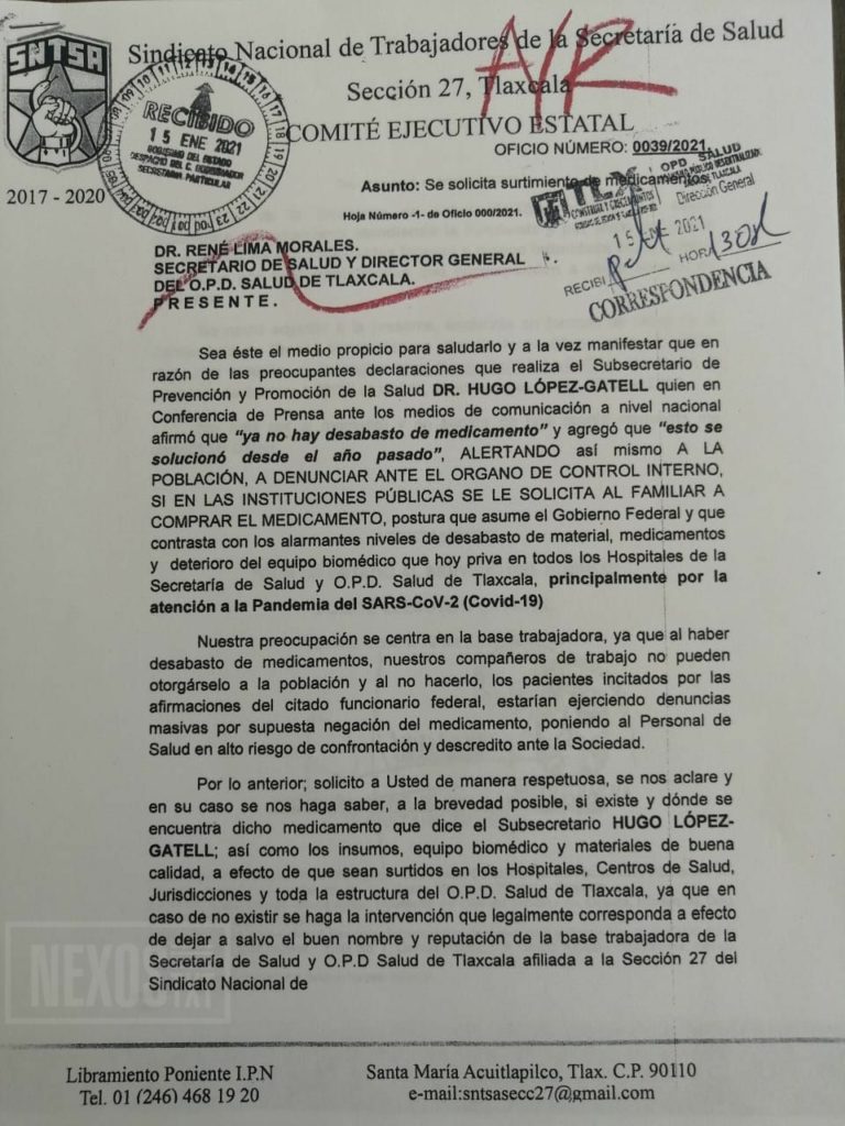 El incremento desmedido de casos por el virus SARS-CoV-2 en Tlaxcala, a provocado que se presente un desabasto de material biomédico y principalmente de medicamentos, reveló el Sindicato Nacional de Trabajadores de la Secretaría de Salud (SNTSA), a través de un oficio dirigido al titular de la Secretaría de Salud (SESA), René Lima Morales.