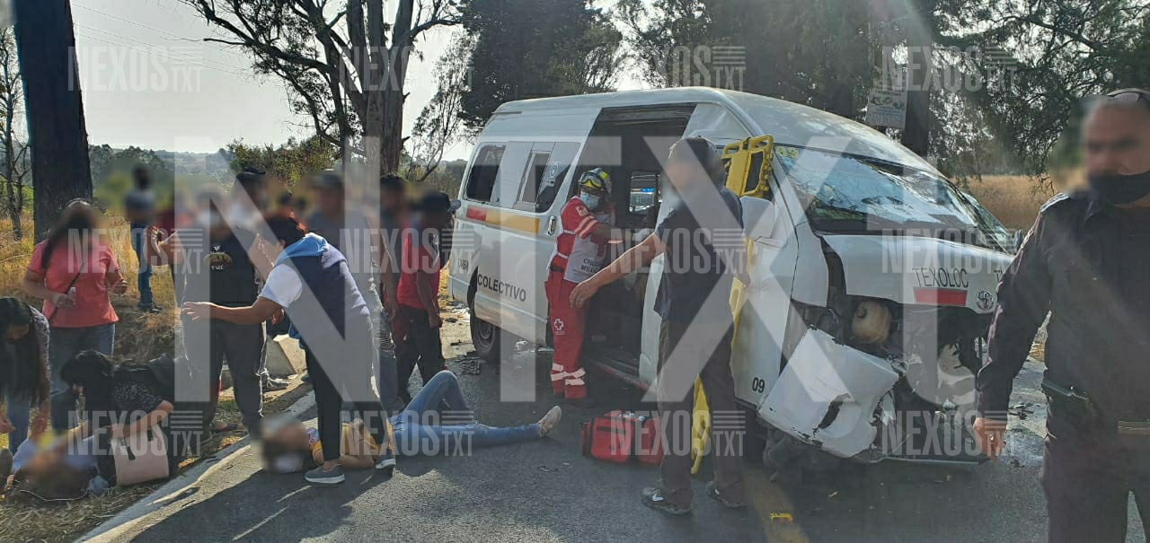 Por lo menos 12 lesiones, fue el saldo que dejó un encontronazo entre un vehículo particular y una unidad de transporte público en la carretera local Tlaxcala-Texoloc, la tarde de este sábado.