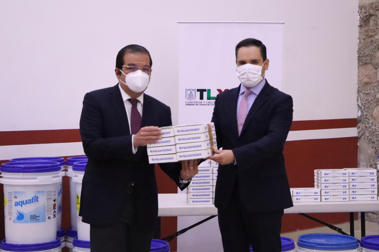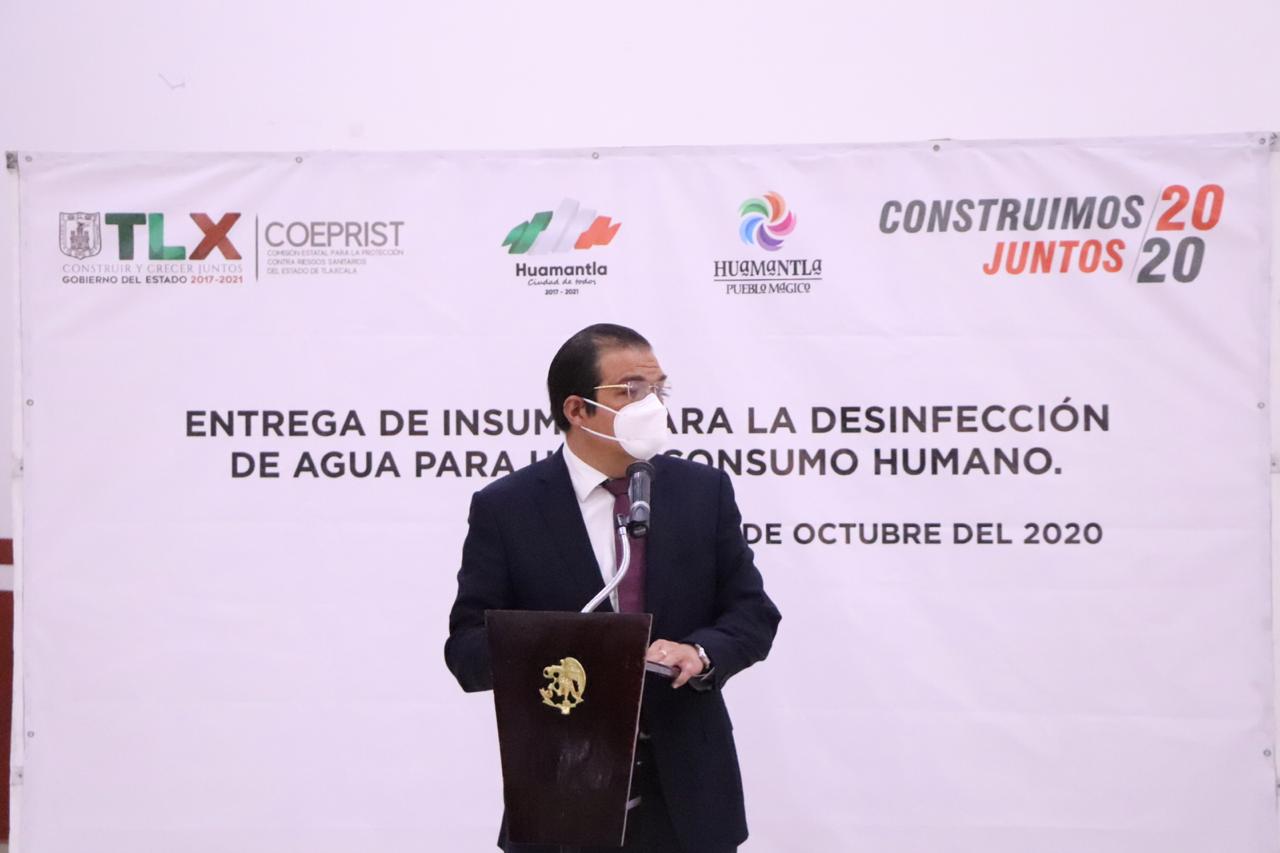 Huamantla, Tlax.- Con el objetivo de que los habitantes del municipio de Huamantla y de otras comunas del estado, cuenten con agua potable para consumo humano de calidad durante la contingencia sanitaria que se vive en el mundo ocasionada por COVID-19, el titular de la Comisión Estatal para la Protección Contra Riesgos Sanitarios del Estado de Tlaxcala, (COEPRIST), Néstor Flores Hernández, realizó la entrega de insumos para la desinfección de agua para uso y consumo humano a los responsables de las comisiones de agua potable de la entidad.