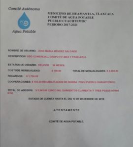 El Diputado José Mendez, del décimo distrito, fue exhibido por el presidente de comunidad de Cuauhtémoc, comunidad de Huamantla, por adeudar la cantidad de 3,600 pesos en el pago de agua potable.