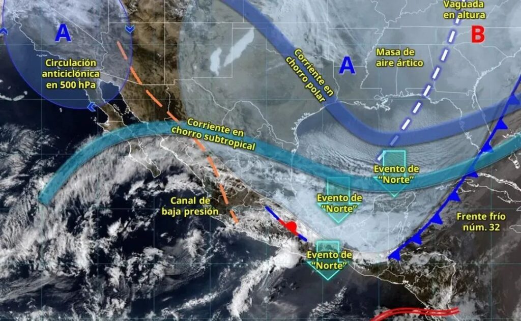 Asimismo, la masa de aire ártico asociada mantendrá un evento de “Norte” muy fuerte a intenso en el litoral del Golfo de México, la Península de Yucatán y el Istmo y Golfo de Tehuantepec, con oleaje elevado en zonas costeras.