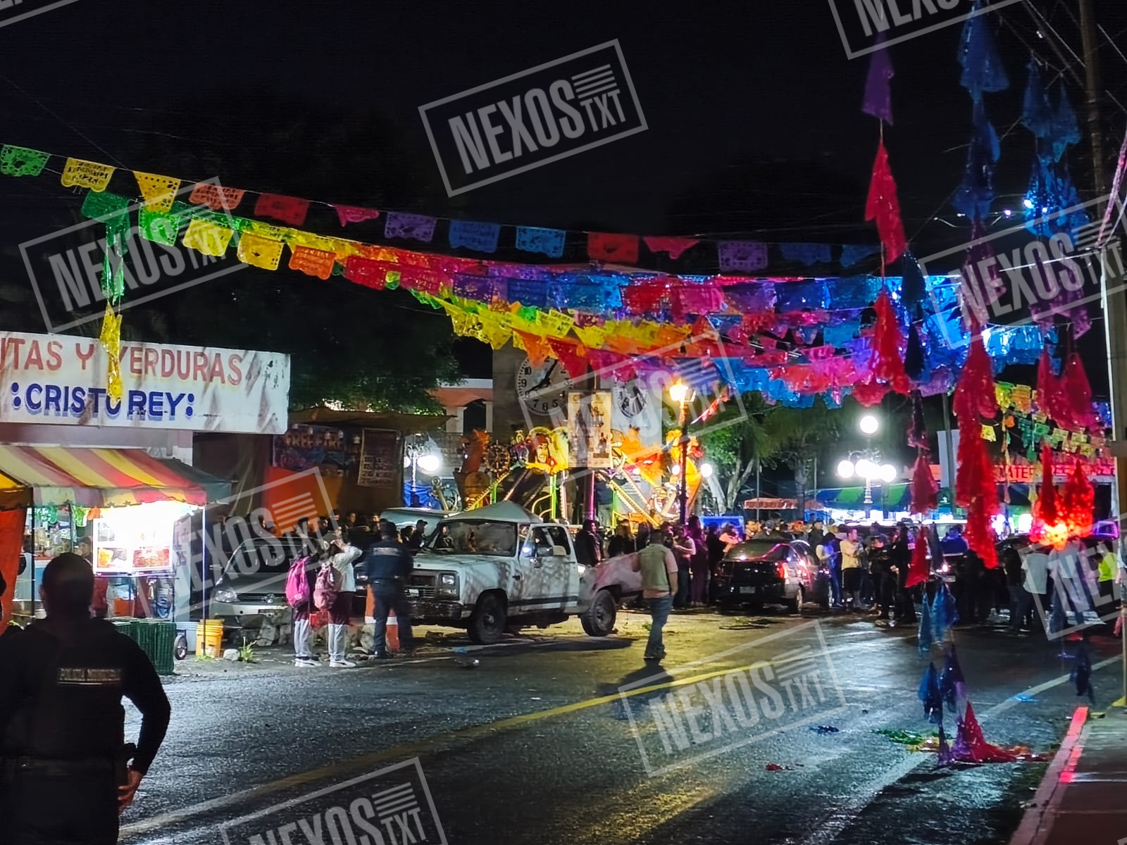 El incidente ocurrió cerca de las 20:20 horas sobre la avenida División del Norte, en la cabecera municipal, cuando una procesión se dirigía hacia la casa de los fiscales, donde se ofrecería una cena a los fieles participantes. En la batea de una camioneta tipo pick up se transportaba pirotecnia, como parte de las festividades.