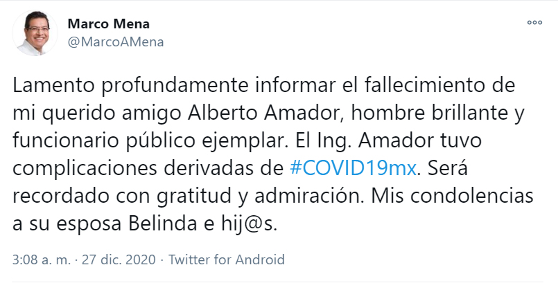 En sus cuentas de redes sociales, el Gobernador Marco Mena escribió: “Lamento profundamente informar el fallecimiento de mi querido amigo Alberto Amador, hombre brillante y funcionario público ejemplar. El Ing. Amador tuvo complicaciones derivadas de #COVID19mx. Será recordado con gratitud y admiración. Mis condolencias a su esposa Belinda e hij@s”.