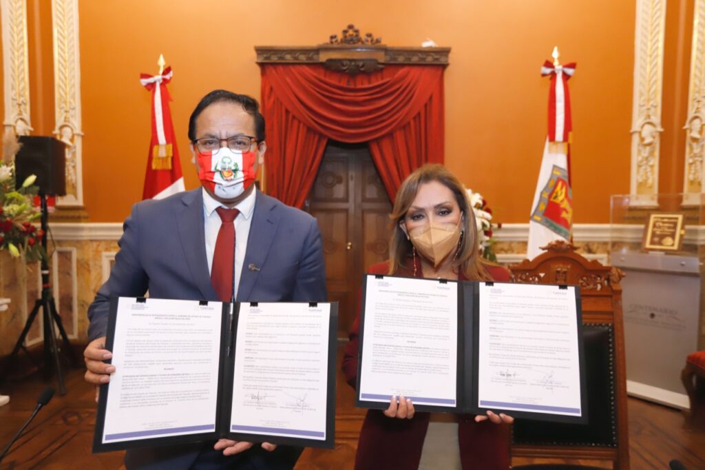 La gobernadora de Tlaxcala, Lorena Cuéllar Cisneros y el Ministro de Comercio Exterior y Turismo del Perú, Roberto Sánchez Palomino, firmaron el memorándum de entendimiento para fortalecer las relaciones en ámbitos económicos, turísticos, culturales y políticos entre ambas administraciones.