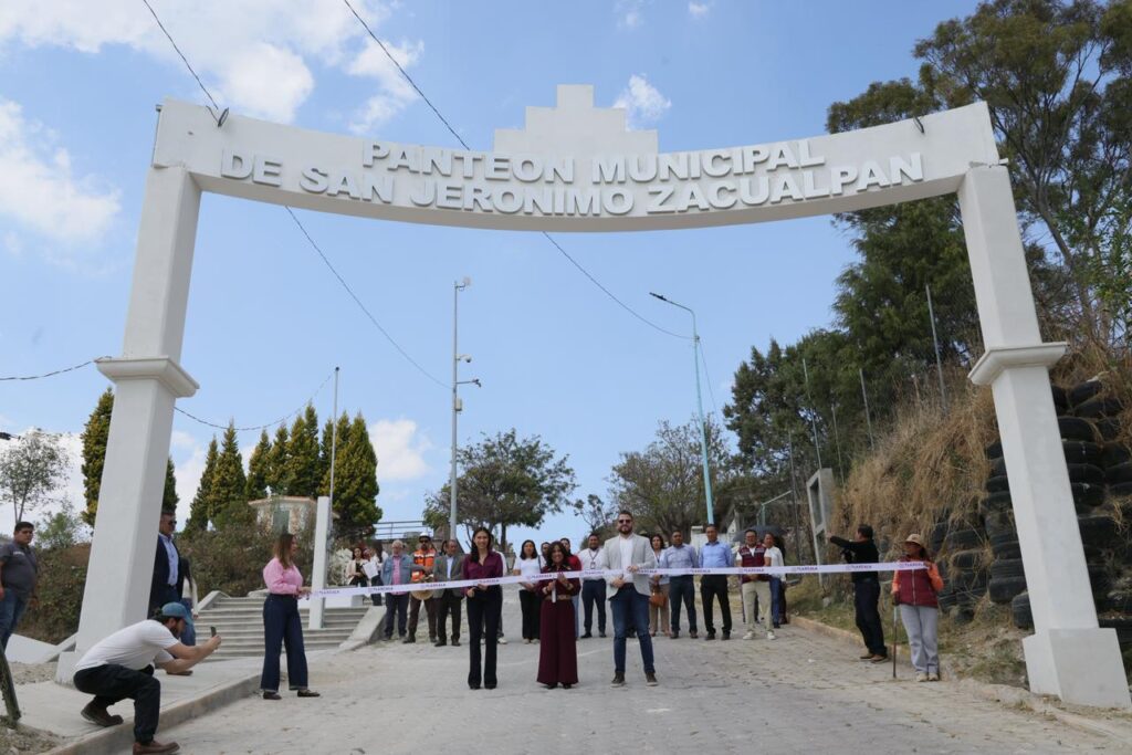 La gobernadora Lorena Cuéllar Cisneros encabezó la inauguración de las obras de rehabilitación del panteón municipal de San Jerónimo Zacualpan, proyecto realizado a través del programa “Peso a Peso” con una inversión total de 3 millones 580 mil pesos, aportados de manera conjunta por el Gobierno del Estado y el Ayuntamiento.