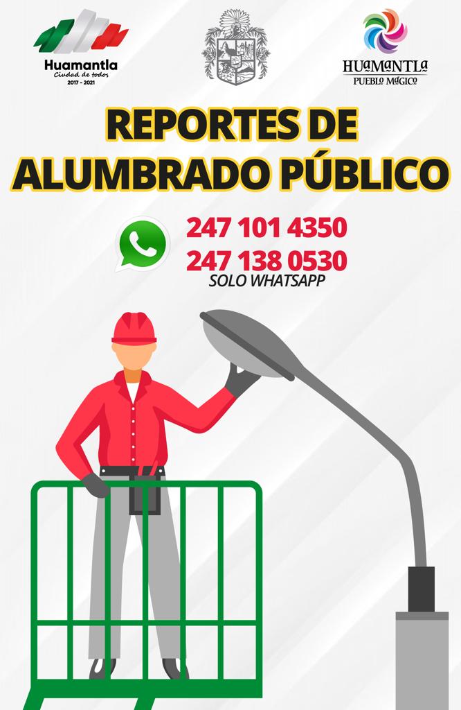 Los números que facilita el Gobierno Municipal son 2471380530 y/o 2471014350, mismos que recibirán todo tipo de reportes, a dicho mensaje deberán agregar la dirección exacta donde se tiene la falta o fallo de alumbrado, así como alguna referencia, nombre del barrio y entre que calles se ubica, con el objetivo de que sea atendido de manera oportuna por personal de la Dirección de Servicios Públicos a través del área de Alumbrado.
