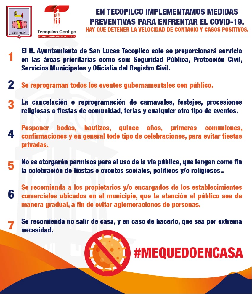 Con la finalidad de evitar contagios por el nuevo virus COVID-19, el alcalde de Tecopilco, Olaf Jonathan Vázquez Morales, contribuyó a fortalecer la difusión de las recomendaciones.