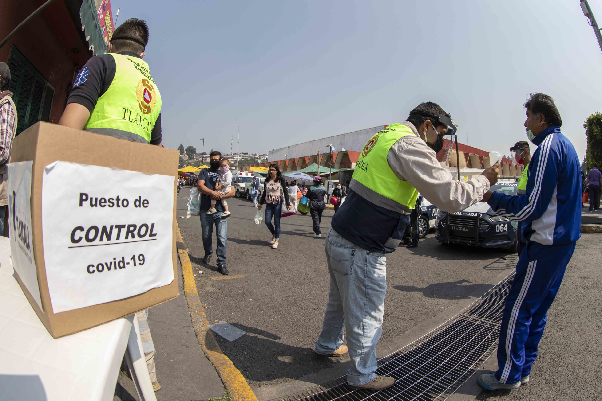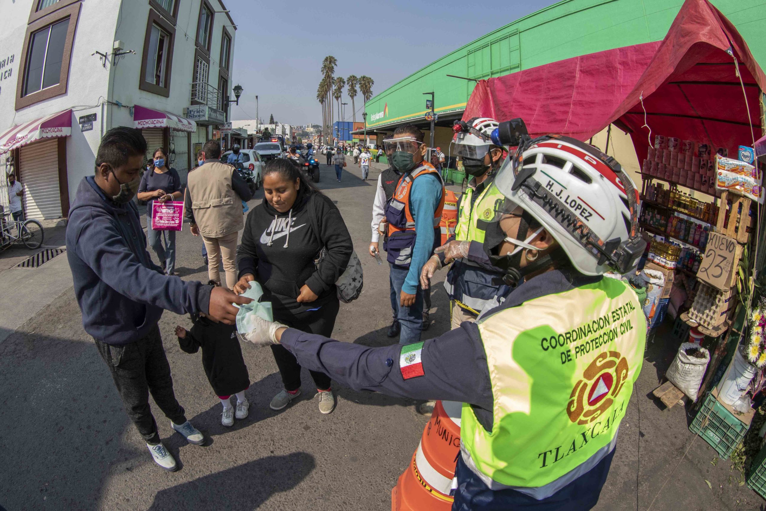 Brigadas conformadas por personal de la CEPC y médicos de la SESA, con el apoyo de Protección Civil y Policía Municipal, distribuyeron cubrebocas y gel antibacterial en diversos centros de abasto instalados en Tlaxcala, Apizaco y Tequexquitla.