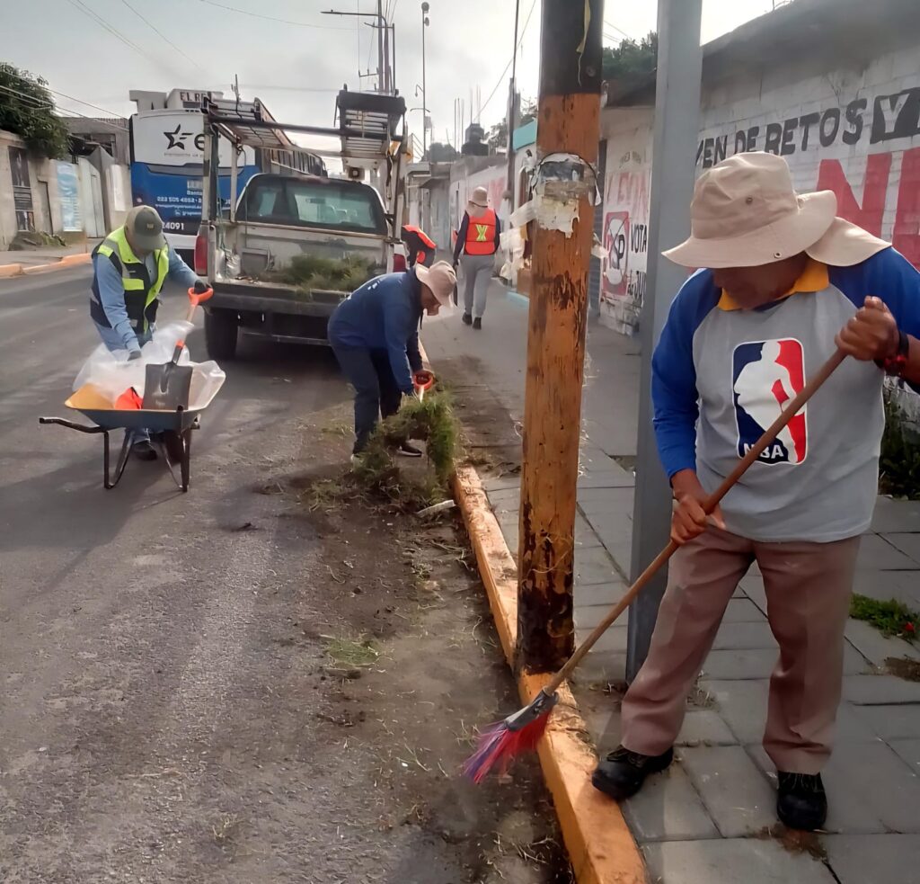 Los trabajos de rehabilitación comprenden el tramo que inicia desde el crucero de Papalotla hasta la vía corta, donde personal del área de Servicios Municipales se encarga de retirar la maleza que se ha proliferado sobre las banquetas y aceras.