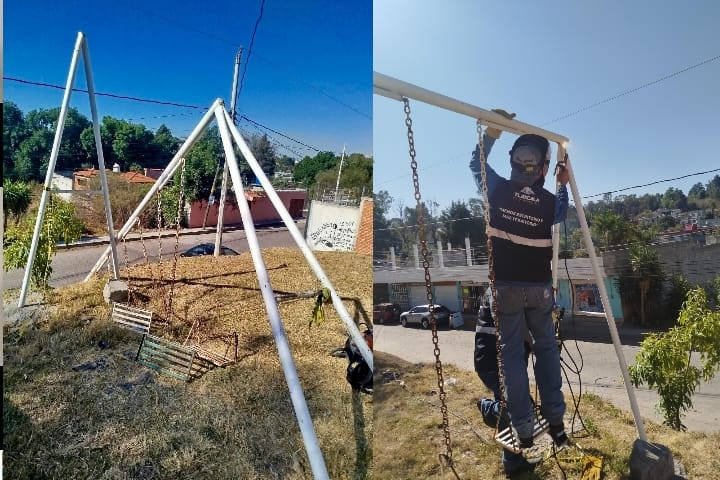 Resultado de lo anterior, este día en la comunidad de Tepehitec se realizaron trabajos de soldadura y rehabilitación de los juegos en la cancha de basquetbol de la calle Emiliano Zapata, lo que garantiza espacios más seguros para la niñez y la juventud.