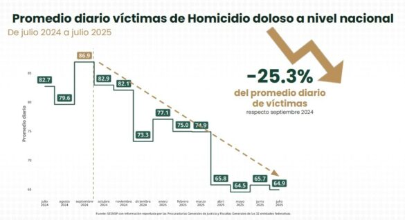 La funcionaria explicó que dicha reducción se debe a que el promedio diario de víctimas de homicidio doloso en septiembre de 2024 fue de 86.9, mientras que, en julio de 2025, de 64.9. Además, resaltó que julio de este año es el mes con el menor número de homicidios registrados en comparación con julio de 2015, todo lo cual atribuyó a la implementación de la Estrategia Nacional de Seguridad.