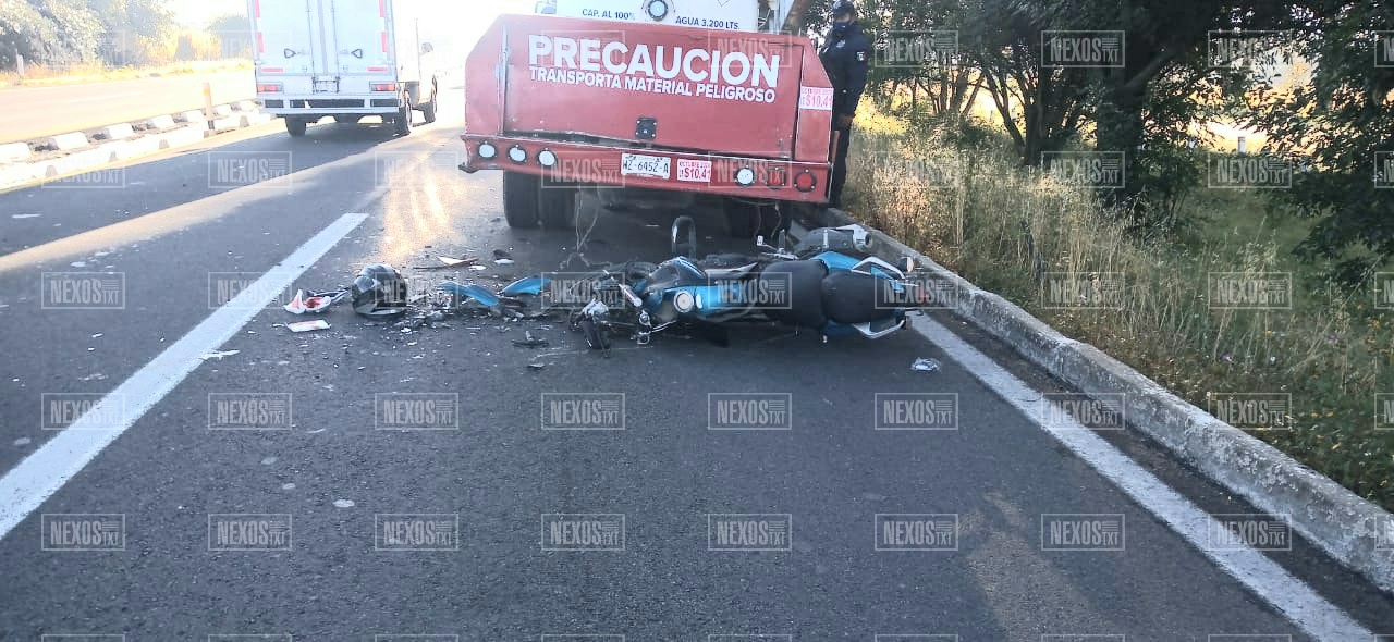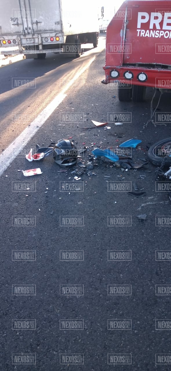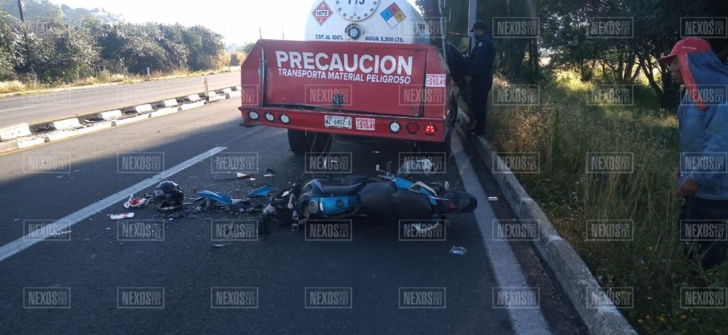 El conductor de una motocicleta, color azul, tipo Yamaha, se debate entre la vida y la muerte, en el Hospital General de Tlaxcala, luego de que la mañana de este jueves, chocara contra una pipa de gas LP, sobre la autopista Tlaxcala – Texmelucan a la altura de El Porvenir, municipio de Ixtacuixtla.