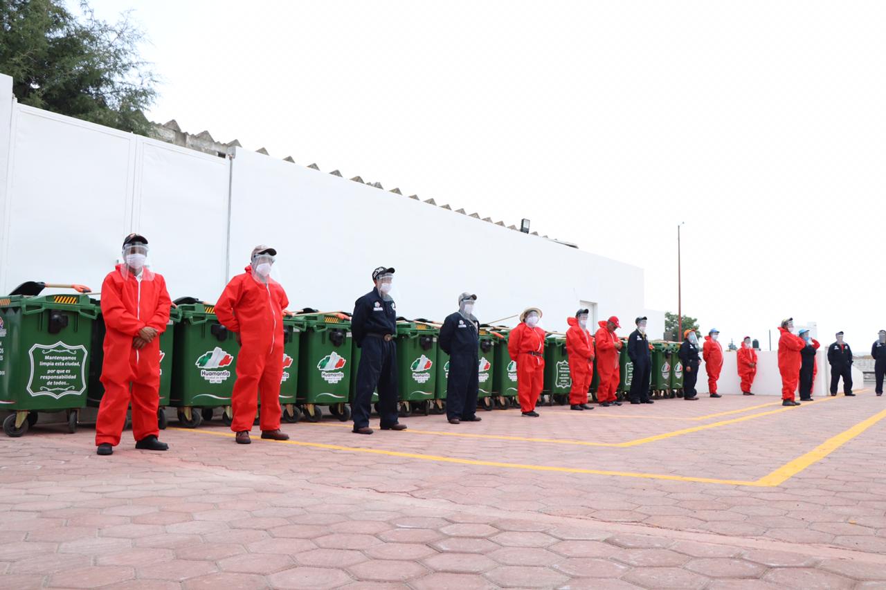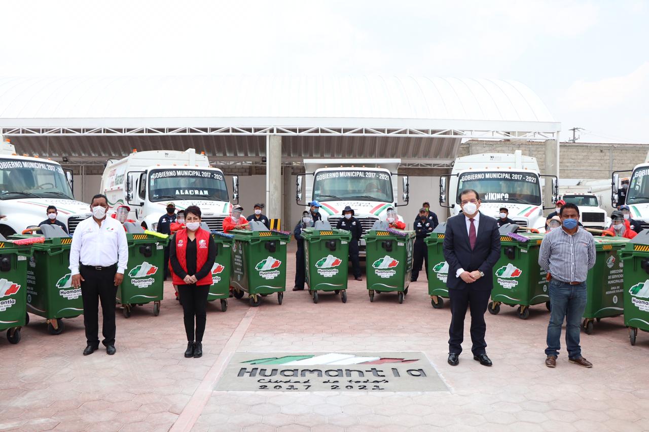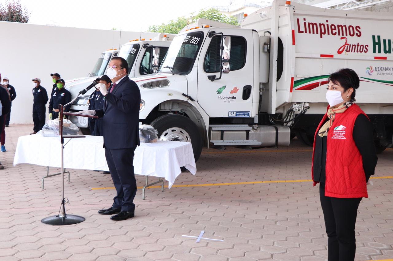 Huamantla, Tlax.- El Presidente Municipal de Huamantla Jorge Sánchez Jasso, reconoció el trabajo que realiza el personal de recolección de residuos sólidos tanto de los camiones como de barrido manual, a quienes con la finalidad de protegerlos durante la pandemia que se vive actualmente por COVID-19 les fueron entregadas caretas de protección y uniformes.