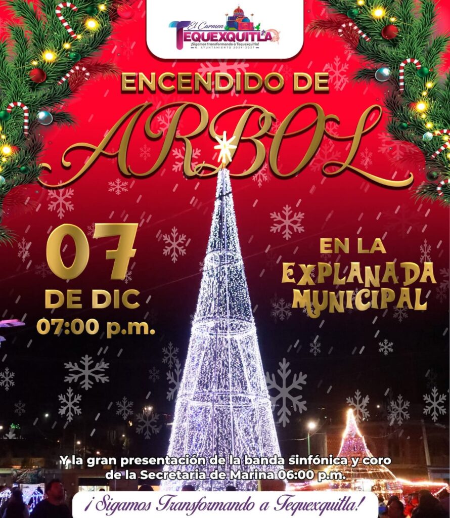 ✨ El Gobierno Municipal de El Carmen Tequexquitla invita con gran entusiasmo a toda la ciudadanía al Encendido del Árbol Navideño 2025, este 07 de diciembre a las 7:00 pm en la explanada municipal. 🎄💫