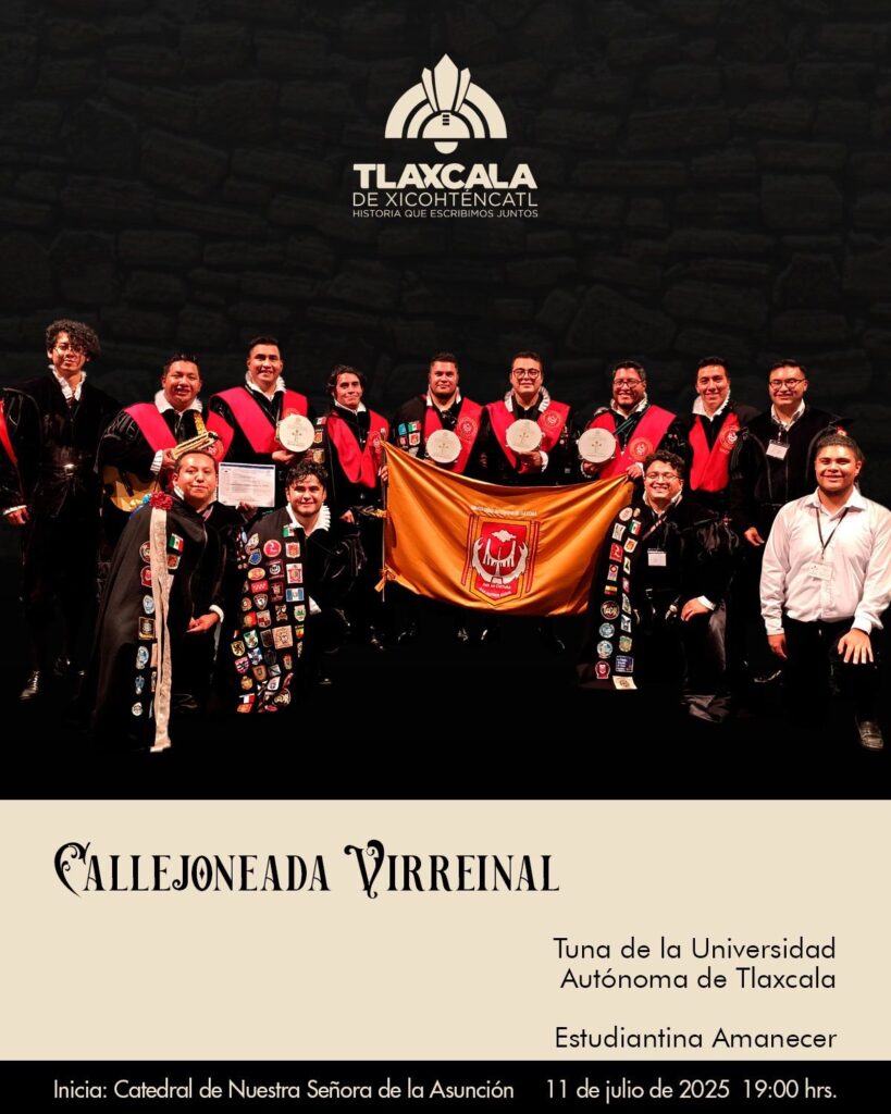 El Ayuntamiento de Tlaxcala, a través del Departamento de Turismo Municipal, te invita a vivir una experiencia que une el arte, la cultura y la memoria de nuestra ciudad: la Callejoneada Virreinal, organizada por la Tuna de la Universidad Autónoma de Tlaxcala y la Estudiantina Amanecer Ocotlán.