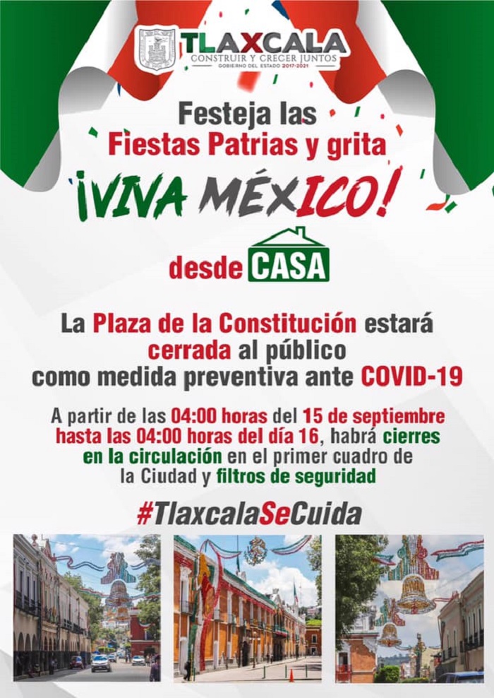 El Gobierno del Estado invita a las familias tlaxcaltecas a celebrar las fiestas patrias desde casa y seguir la transmisión especial del mensaje del Gobernador Marco Mena alusivo al 210 aniversario del Inicio de la Independencia de México a través de la señal de Tlaxcala Televisión y las plataformas digitales del gobierno.