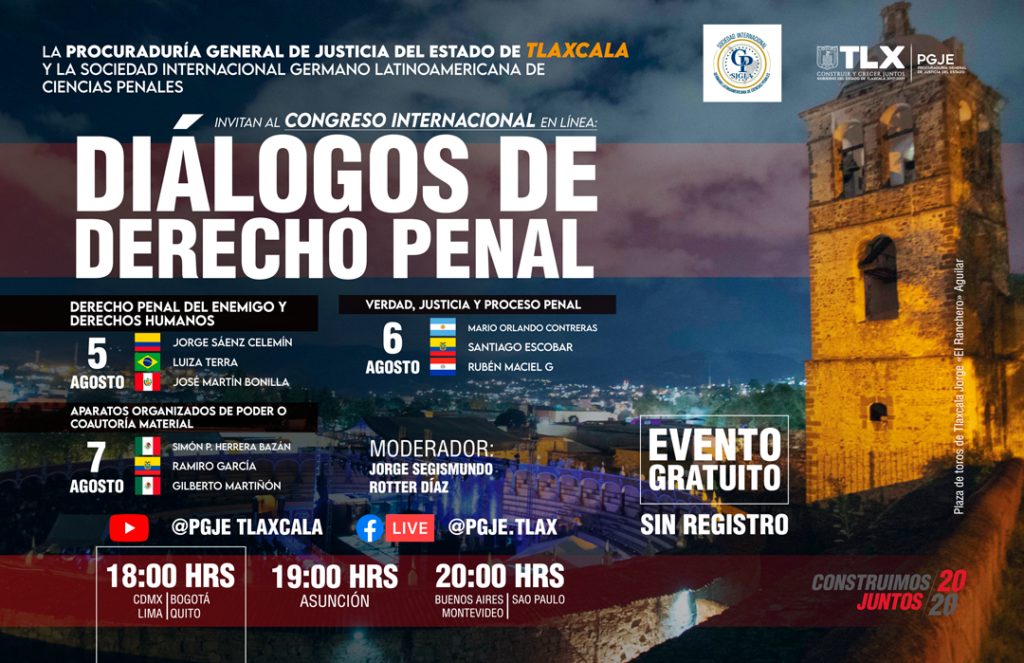 Como parte de las actividades académicas que lleva a cabo la PGJE en coordinación con la Sociedad Internacional Germano Latinoamericana de Ciencias Penales, para promover la preparación académica de los abogados penalistas, se hace extensiva la invitación para aquellos interesados en participar en las mesas de trabajo y exposiciones que se llevarán a cabo por académicos reconocidos a nivel internacional.