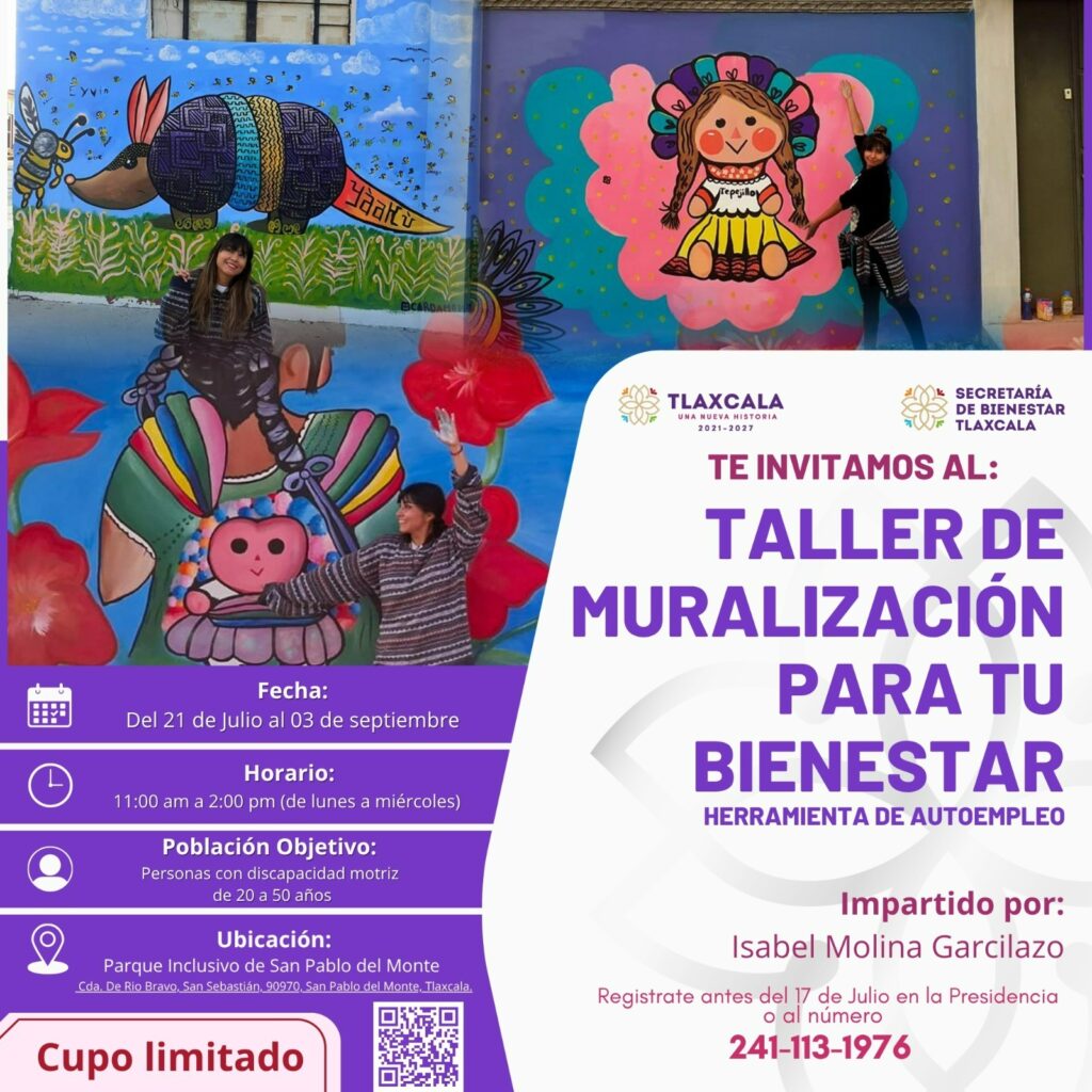 La Secretaría de Bienestar Tlaxcala, en coordinación con autoridades municipales, lanzó la convocatoria al “Taller de Muralización para tu Bienestar”, impartido por Isabel Molina Garcilazo y dirigido a personas con discapacidad motriz de entre 20 y 50 años.