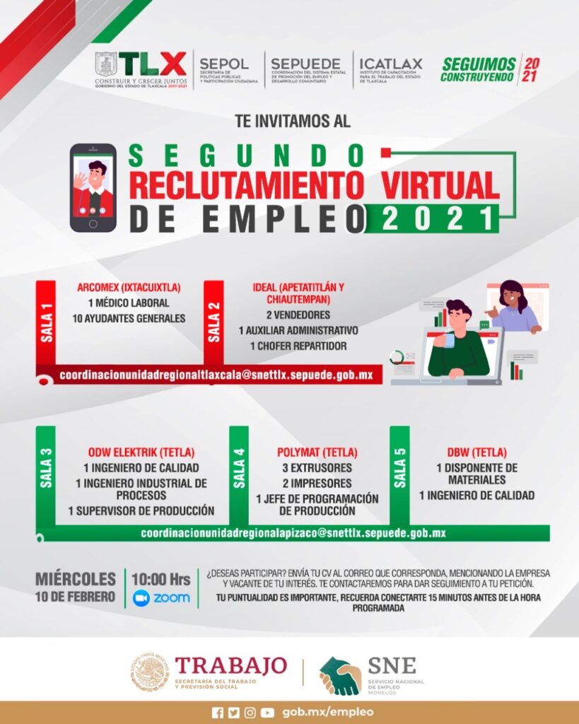 Con la participación de cinco empresas instaladas en la entidad, la Secretaría de Políticas Públicas y del Sistema Estatal de Promoción del Empleo (Sepol-Sepuede), a través del Servicio Nacional del Empleo en Tlaxcala (SNE), realizará el segundo Reclutamiento Virtual de Empleo del año, el próximo miércoles 10 de febrero a las 10:00 horas.
