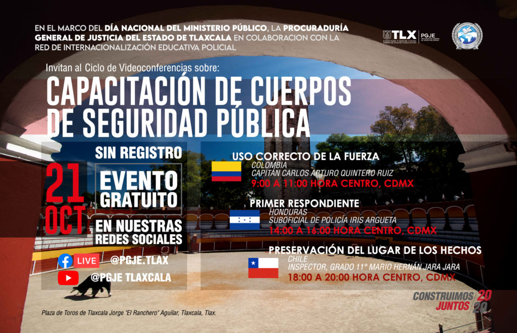 En el marco de la celebración del Día Nacional del Ministerio Público, la Procuraduría General de Justicia del Estado (PGJE) en coordinación con la Red de Internacionalización Educativa Policial, invitan al ciclo de videoconferencias sobre “Capacitación de Cuerpos de Seguridad”, que se llevará a cabo el próximo 21 de octubre y que contará con la participación de ponentes de talla internacional.