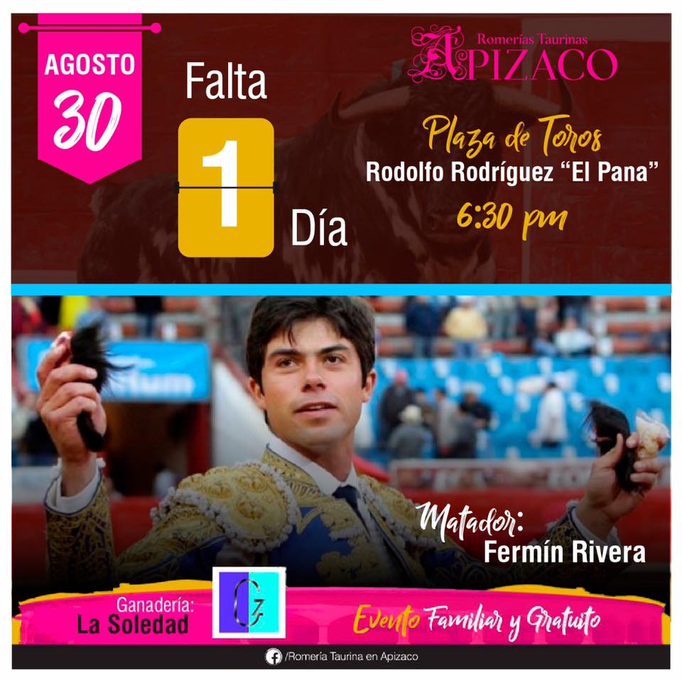 El matador de toros Fermín Rivera, resaltará el cartel de la quinta fecha de la Tercera Temporada de Romerías Taurinas Apizaco, a celebrarse el día de mañana en la Plaza de Toros Rodolfo Rodríguez El Pana, así lo anunció el Gobierno Municipal.
