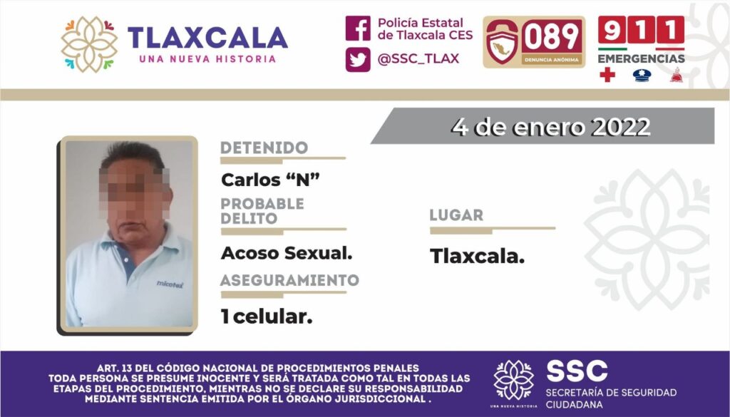 Elementos de la Dirección de Seguridad Delegación Tlaxcala pertenecientes a la Secretaría de Seguridad Ciudadana (SSC), detuvieron a una persona por el probable delito de acoso sexual.