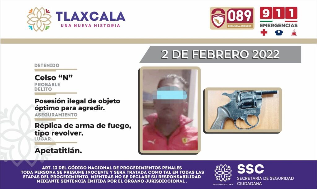 Personal de la Dirección de Seguridad perteneciente a la Secretaría de Seguridad Ciudadana (SSC), detuvo en el municipio de San Pablo Apetatitlán a una persona que portaba una réplica de arma de fuego.