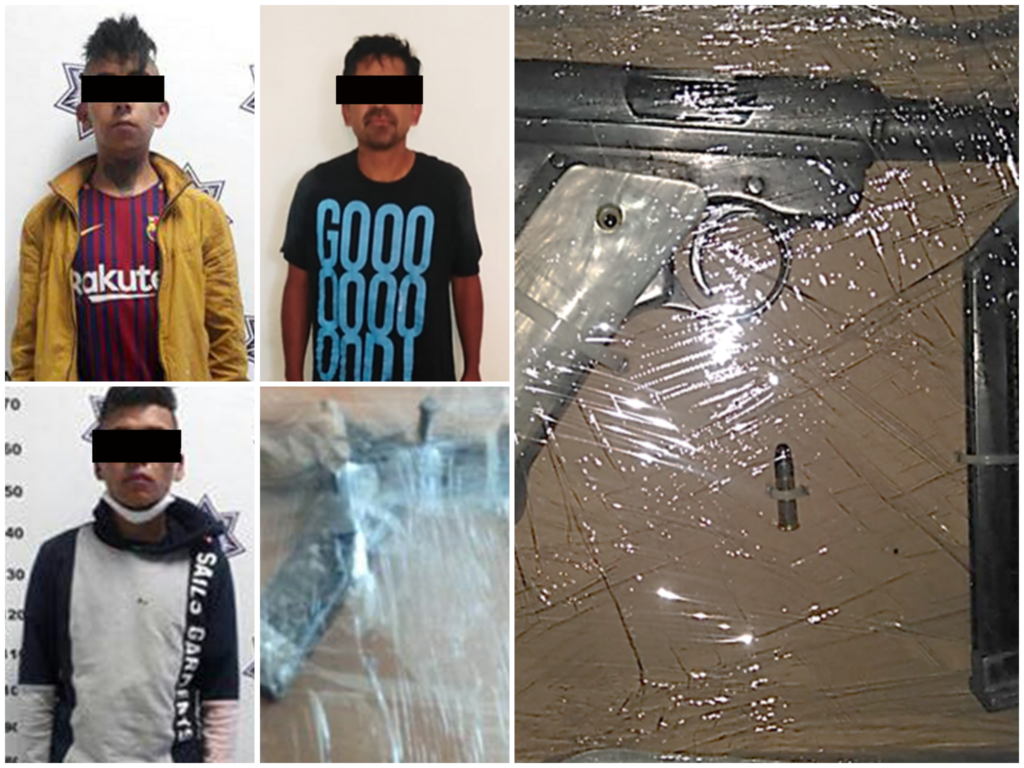 Tras dar alcance al vehículo sobre un camino de terracería sin nombre en la comunidad de Atlayoalco, municipio de Apizaco; se logró la detención de tres masculinos y el aseguramiento de un arma de fuego de fabricación artesanal calibre .22 que se encontraba en el interior de la unidad.