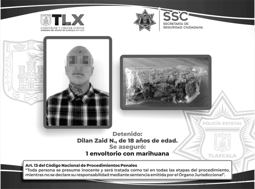 Siendo un hecho constitutivo de delito, ya que el sujeto identificado como Dilan N., de 18 años de edad portaba una cantidad aproximada de marihuana que excede la dosis máxima de consumo personal e inmediato permitido por la Ley General de Salud, establecido en su artículo 479; fue detenido.