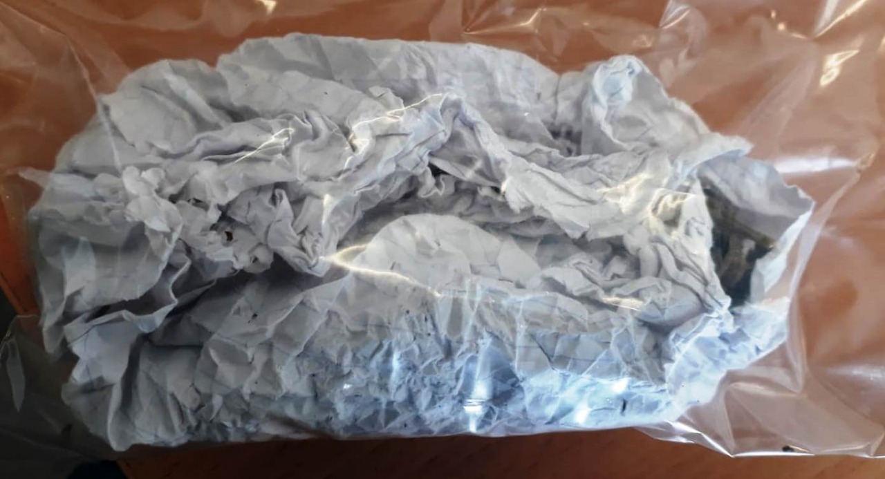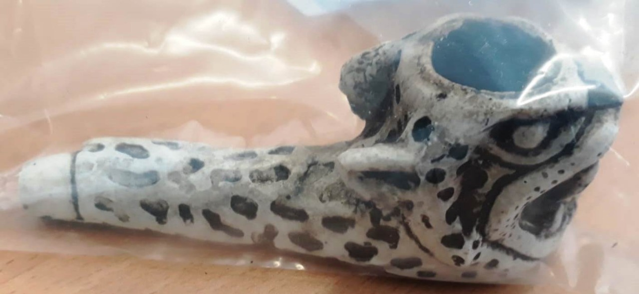 Por lo que, procedieron a inquirir al sujeto a fin de prevenir alguna acción que pudiera infringir la ley y mediante una inspección preventiva, localizaron entre sus pertenencias una pipa de yeso de color blanco con manchas negras, con forma de cabeza de jaguar, que contiene en su interior hierba seca color verde con las características propias de la marihuana, así como un envoltorio de papel color blanco (hoja de libreta) que en su interior contiene la misma hierba seca.