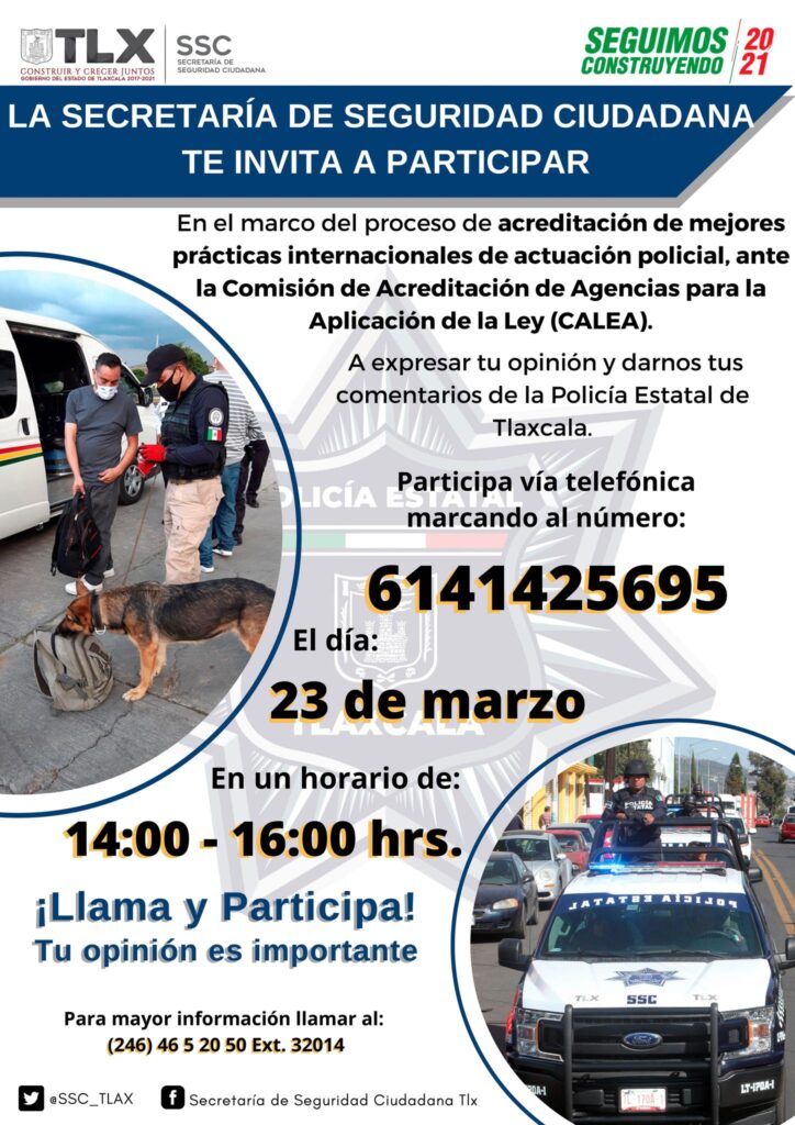 En el marco del proceso de acreditación ante la Comisión de Acreditación para Agencias de Aplicación de la Ley (CALEA, por sus siglas en inglés), la Secretaría de Seguridad Ciudadana (SSC) invita a la sociedad en general a participar para expresar su opinión o comentario de la Policía Estatal.