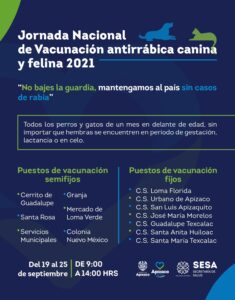 El Gobierno Municipal de Apizaco informó que del próximo domingo 19 al 25 de septiembre, de 9 am a 2 pm, se llevará a cabo la Jornada Nacional de vacunación antirrábica canina y felina 2021, “no bajes la guardia, mantengamos al país sin casos de rabia”