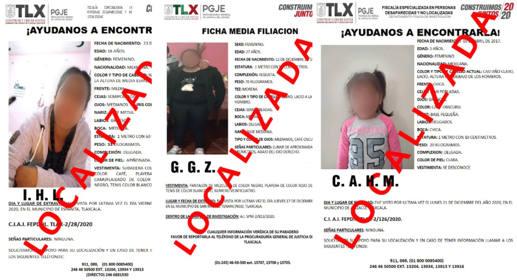 La Procuraduría General de Justicia del Estado (PGJE) localizó a dos menores de edad y a una mujer de 27 años de edad reportadas como extraviadas; posterior a las investigaciones se estableció que sus ausencias no están relacionadas con la comisión de algún delito.