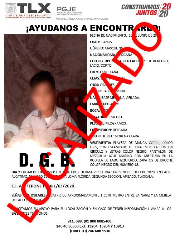 Ante esta situación, los investigadores tras realizar diversas labores de campo en coordinación con la policía municipal de Xaloztoc, localizaron al menor con su padre, quien fue presentado ante el Representante Social donde se descartó que su desaparición estuviera relacionada con algún delito.