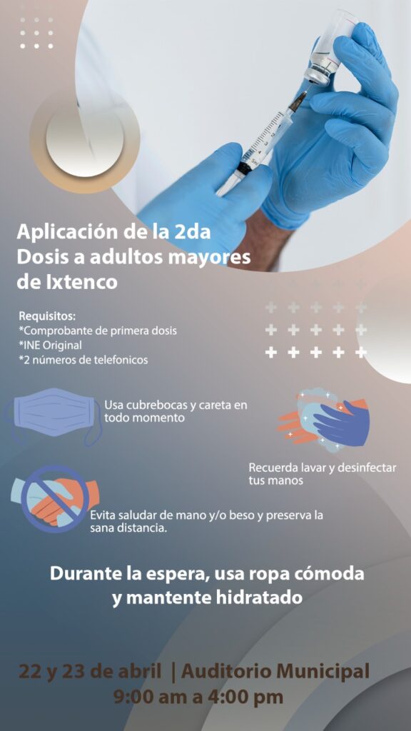 El día de mañana, iniciará en Ixtenco la segunda etapa de la aplicación de la vacuna para los adultos mayores de esa demarcación, la vacuna será aplicada los días 22 y 23 de abril.